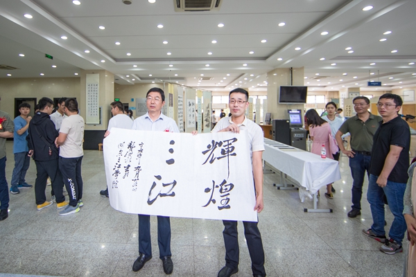 党委常务副书记、副校长周更生为活动致开幕辞,他向到场的诸位来宾致以诚挚的问候,对于兄弟高校及龙神书画艺术研究院、中国书法家园网、南京市青年书法家协会的大力帮助支持,表示衷心的感谢。70年砥砺奋进,我们的国家发生了翻天覆地的变化,他倡导广大师生通过书画篆刻作品创作及展览、参观的方式,展现新中国成立以来的伟大成就,讴歌新时代,唱响主旋律,充分展示beat365师生积极昂扬、奋发向前的精神面貌。随后龙神书画艺术研究院院长、中国书法家协会会员龚洪林致辞,beat365vip官网登录入口一直以来重视人文发展,积极参加书画活动,在江苏名列前茅。新竹高于旧竹枝,全凭老干为扶持。龚院长语重心长地叮嘱三江学子,从三江走出的学生,应心怀感恩,为三江争光添彩。