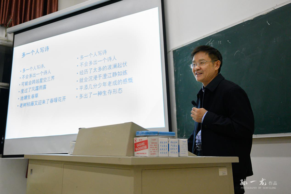 周建忠院长的讲座内蕴深厚,讲解深入浅出。他告诉同学们:诗,来源于生活与感动,具有特殊的魅力,是人类交流、发展、成长的重要途径。写诗的过程就是把生活中的点点滴滴与日常的观察、四季的轮回、人生的思考等紧密联系起来并加以提炼,因此,它是一个国家、时代、群体、人物的记忆,对我们的精神生活具有积极的意义。他说,诗人有三种状态:解读诗、创作诗和随性赋诗,并借助《金刚经》讲述了作诗的六种灵感和寻找诗歌素材的方法。最后,周院长送给老师和同学们一联诗句:“朗月照人如鉴临水,时雨润木自叶流根”以表祝福。