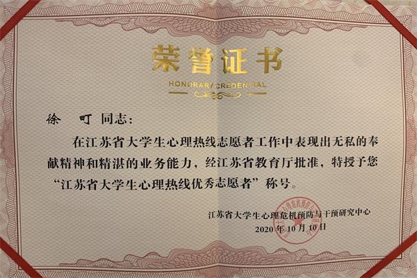 10月10日是第29个世界精神卫生日,今年世界精神卫生日的主题是“弘扬抗疫精神,护佑心理健康”。同时,也是江苏省大学生心理热线暨大学生心理自助互助平台——苏心APP成功运行一周年的日子。在今年抗击疫情的战役中,徐町老师和来自全省各高校的272名热线志愿者老师奋战在心理热线咨询和危机预防干预的第一线,并参与了《新型冠状病毒肺炎疫情防控江苏省大学生心理健康指导手册》的编写以及《手册》中微课的制作,同时还参加了武汉市精神卫生中心“心心语”心理热线工作。
