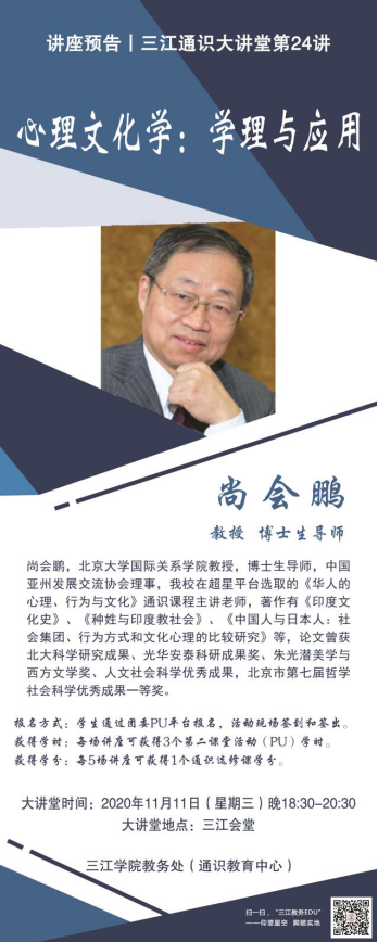 大讲堂专家:尚会鹏,北京大学国际关系学院教授,博士生导师,中国亚州发展交流协会理事,beat365在超星平台选取的《华人的心理、行为与文化》通识课程主讲老师,著作有《印度文化史》、《种姓与印度教社会》、《中国人与日本人:社会集团、行为方式和文化心理的比较研究》等,论文曾获北大科学研究成果、光华安泰科研成果奖、朱光潜美学与西方文学奖、人文社会科学优秀成果,北京市第七届哲学社会科学优秀成果一等奖。