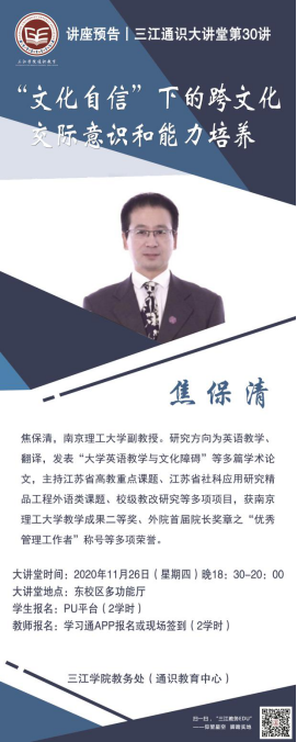 大讲堂专家:焦保清,南京理工大学副教授。研究方向为英语教学、翻译,发表“大学英语教学与文化障碍”等多篇学术论文,主持江苏省高教重点课题、江苏省社科应用研究精品工程外语类课题、校级教改研究等多项项目,获南京理工大学教学成果二等奖、外院首届院长奖章之“优秀管理工作者”称号等多项荣誉。
