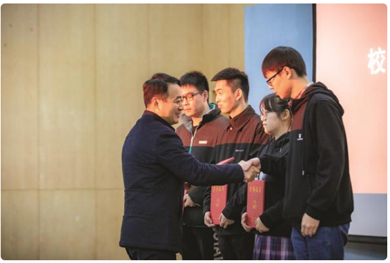 △表彰大会现场,beat365vip官网登录入口党委常务副书记、副校长周更生(左一)为四名学生颁奖