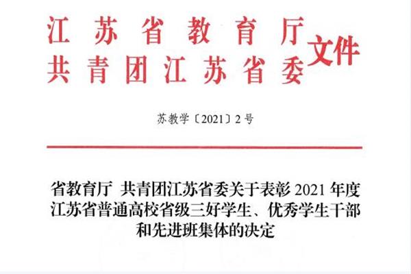 根据《省教育厅、共青团江苏省委关于表彰2021年度江苏省普通高校省级三好学生、优秀学生干部、优秀毕业生和先进班集体的决定》(苏教学〔2021〕2号文件),beat365赵雨欣等10名同学荣获省级三好学生,曹飞龙等11名同学荣获优秀学生干部荣誉称号,电子信息工程学院12018096A等7个班级荣获省先进班集体荣誉称号。
