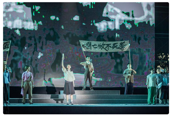 舞台上,一位老教师走来,四处打量。他拿起一本旧影集翻看,记忆随着影集飘去了很远的地方,他的轻声诉说带领大家重温了一段艰难的岁月。第二篇章《黄河 · 不屈抗争》就此正式开启。 长亭外,古道边,芳草碧连天。《送别》歌曲让时间穿越到抗战前夕的国立中央大学校园里。淡淡的旋律谱出了离愁,优美的歌词写出了别绪,听来让人百感交集。《毕业歌》中,学生们将中国青年学生的年轻激情、爱国深情进行了淋漓尽致的表达,传递出一代青年 天下兴亡,匹夫有责 的爱国激情。 风在吼,马在叫。黄河在咆哮,黄河在咆哮。《保卫黄河》曲毕,波涛汹涌的黄河和英勇向前的战士仿佛近在眼前,抓住了每个聆听者的心声。