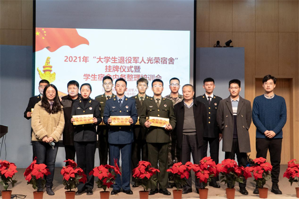 为了充分发挥退伍军人在宿舍内务中的先锋模范作用,进一步培养学生良好的生活习惯,增强学生的生活自理能力。12月8日,学生发展与服务中心在学术报告厅举办2021年“大学生退役军人光荣宿舍”挂牌仪式暨学生宿舍内务整理培训会。学生发展与服务中心以及各学院(校区)相关老师出席,各宿舍楼楼长、部分大一学生代表以及大学生退役军人协会全体成员参加。会议由大学生退役军人协会会长王守宇主持。