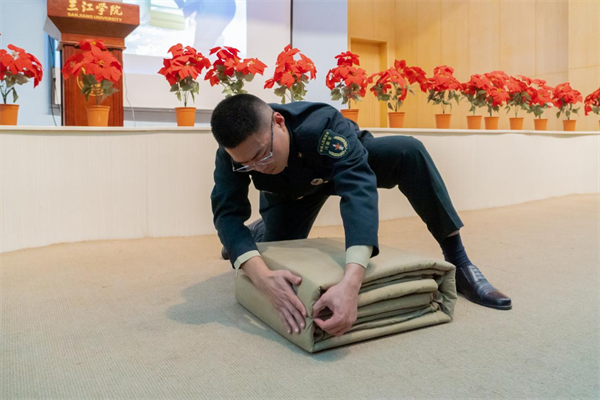 最后,由退役军人韩啸同学做学生宿舍内务整理培训,系统了讲解内务卫生的整理方法,带领大家观看“对豆腐块被子的指导”视频。同时,在活动现场为大家示范叠“豆腐块”被子。