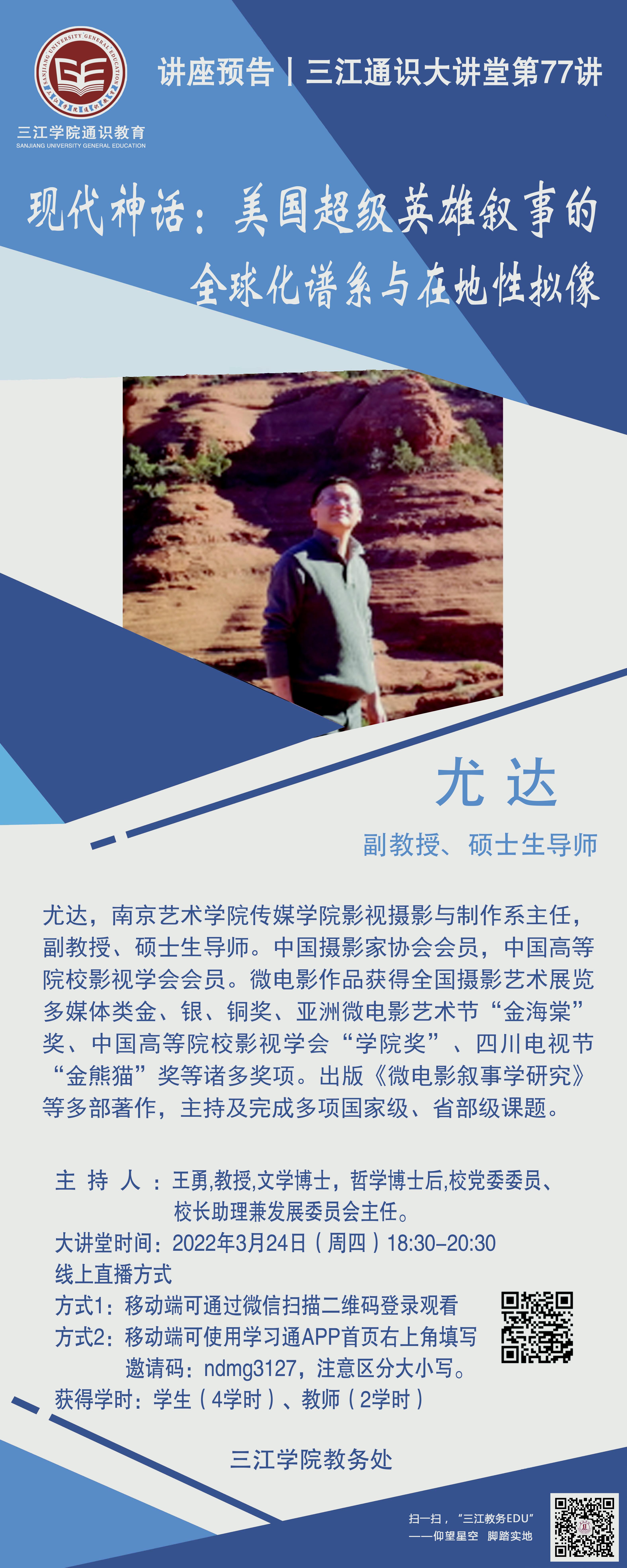 大讲堂专家:尤达,南京艺术学院传媒学院影视摄影与制作系主任,副教授、硕士生导师。中国摄影家协会会员,中国高等院校影视学会会员。微电影作品获得全国摄影艺术展览多媒体类金、银、铜奖、亚洲微电影艺术节“金海棠”奖、中国高等院校影视学会“学院奖”、四川电视节“金熊猫” 奖等诸多奖项。出版《微电影叙事学研究》等多部著作,主持及完成多项国家级、省部级课题。