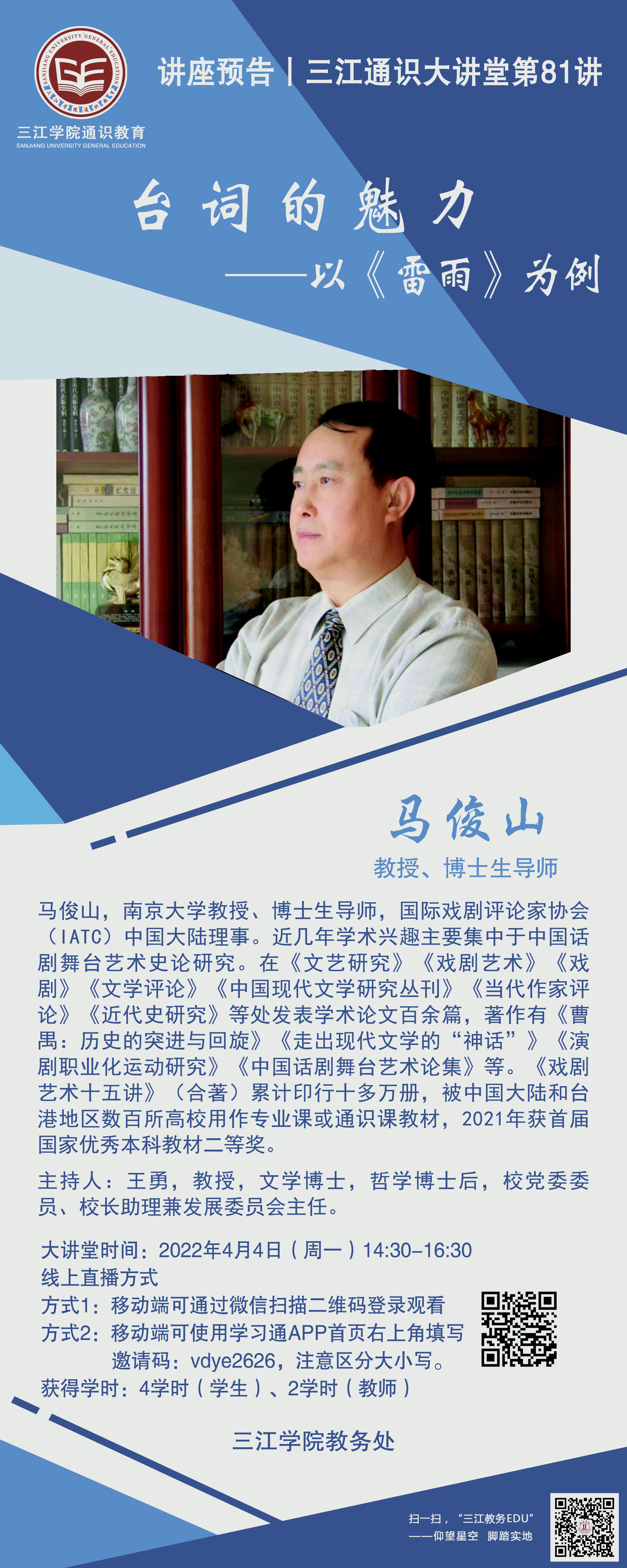 大讲堂专家:马俊山,南京大学教授、博士生导师,国际戏剧评论家协会(IATC)中国大陆理事。近几年学术兴趣主要集中于中国话剧舞台艺术史论研究。在《文艺研究》《戏剧艺术》《戏剧》《文学评论》《中国现代文学研究丛刊》《当代作家评论》《近代史研究》等处发表学术论文百余篇,著作有《曹禺:历史的突进与回旋》《走出现代文学的“神话”》《演剧职业化运动研究》《中国话剧舞台艺术论集》等。《戏剧艺术十五讲》(合著)累计印行十多万册,被中国大陆和台港地区数百所高校用作专业课或通识课教材,2021年获首届国家优秀本科教材二等奖。