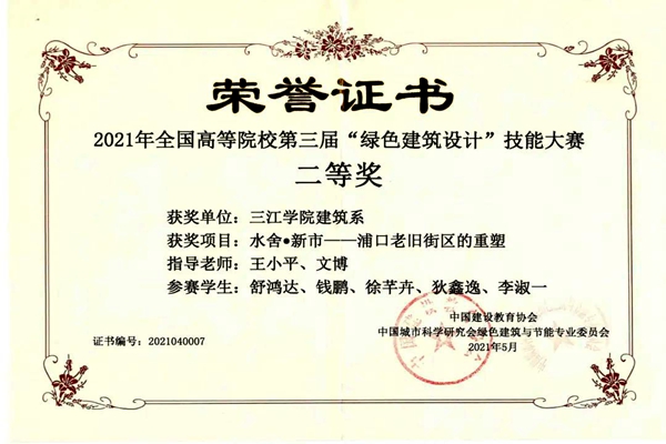曾获“第十四届谷雨杯全国大学生可持续建筑设计竞赛”入围奖、“江苏省第十五届室内装饰设计大赛”学生室内创意设计(公共建筑)三等奖、“第八届中国装饰设计大赛(CBDA设计奖)”商业空间组银奖、“中哲杯专业设计竞赛”高年级组一等奖、“G-CROSS全球大学生创意奖”铜奖、“第三届全国高等院校绿色建筑设计技能大赛”二等奖、“江苏省中建七局杯大学生先进成图技术与产品信息建模(BIM)创新大赛”团体奖三等奖、“江苏省中建七局杯大学生先进成图技术与产品信息建模(BIM)创新大赛”个人奖二等奖、“第十四届高教杯全国大学生先进成图技术与产品信息建模创新大赛”建筑类个人全能奖二等奖、“第九届 全国高校数字艺术设计大赛”江苏省一等奖、“第九届 全国高校数字艺术设计大赛”全国二等奖、“新加坡金沙艺术设计大赛”银奖、“南京市室内设计新人新作奖”二等奖、“互联网+创新创业大赛”校二等奖、“首届苏州市最江南农房设计大赛”二等奖、“台达杯国际太阳能十项全能竞赛”入围奖。