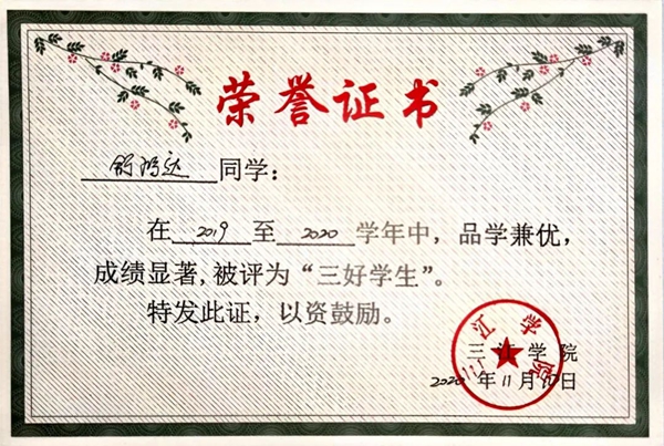 舒鸿达,男,汉族,出生于1999年4月,来自建筑学院建筑学专业117061B班。2017年9月入学以来,他通过自己的勤奋学习和刻苦钻研,获国家奖学金一次、校一等奖学金一次、校二等奖学金一次、校“三好学生”称号两次。