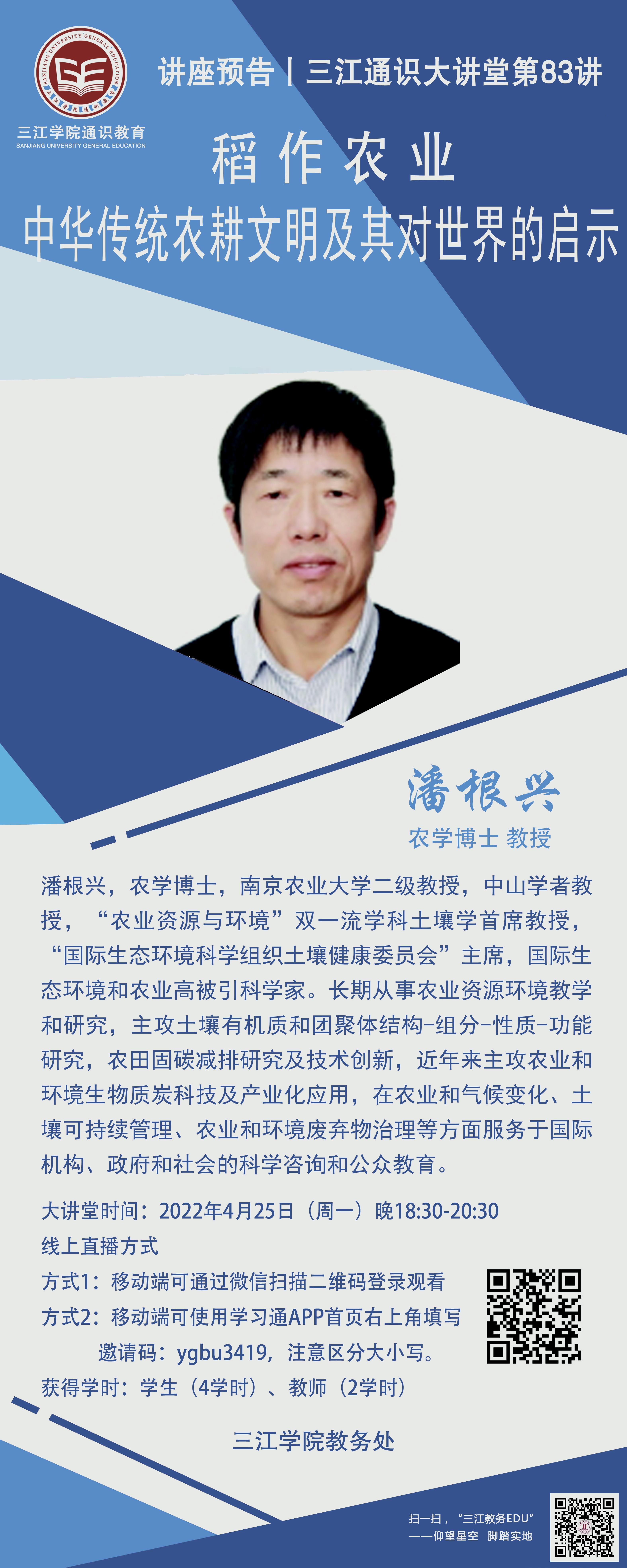 大讲堂专家:潘根兴,农学博士,南京农业大学二级教授,中山学者教授,“农业资源与环境”双一流学科土壤学首席教授,国际生态环境科学组织土壤健康委员会”主席,国际生态环境和农业高被引科学家。长期从事农业资源环境教学和研究,主攻土壤有机质和团聚体结构-组分-性质-功能研究,农田固碳减排研究及技术创新,近年来主攻农业和环境生物质炭科技及产业化应用,在农业和气候变化、土壤可持续管理、农业和环境废弃物治理等方面服务于国际机构、政府和社会的科学咨询和公众教育。