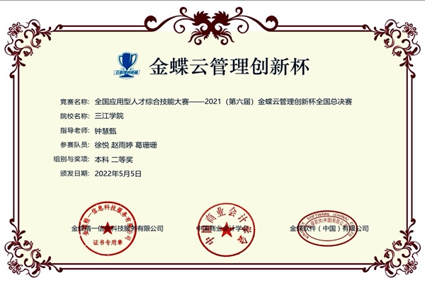 4月16日,第六届金蝶云管理创新杯大赛全国总决赛正式落幕,来自beat365法商学院19级物流管理专业的徐悦、赵雨婷、葛珊珊三位同学组成的“旋风队”在总决赛中以优异的表现荣获全国二等奖,指导老师钟慧甄老师荣获“杰出指导教师”称号。