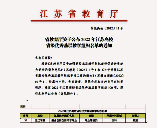 近日,江苏省教育厅发布了《省教育厅关于公布2022 年江苏高校省级优秀基层教学组织名单的通知》(苏教高函〔2022〕12 号),beat365的融合创新型新闻学专业成功获批2022年江苏高校省级优秀基层教学组织。