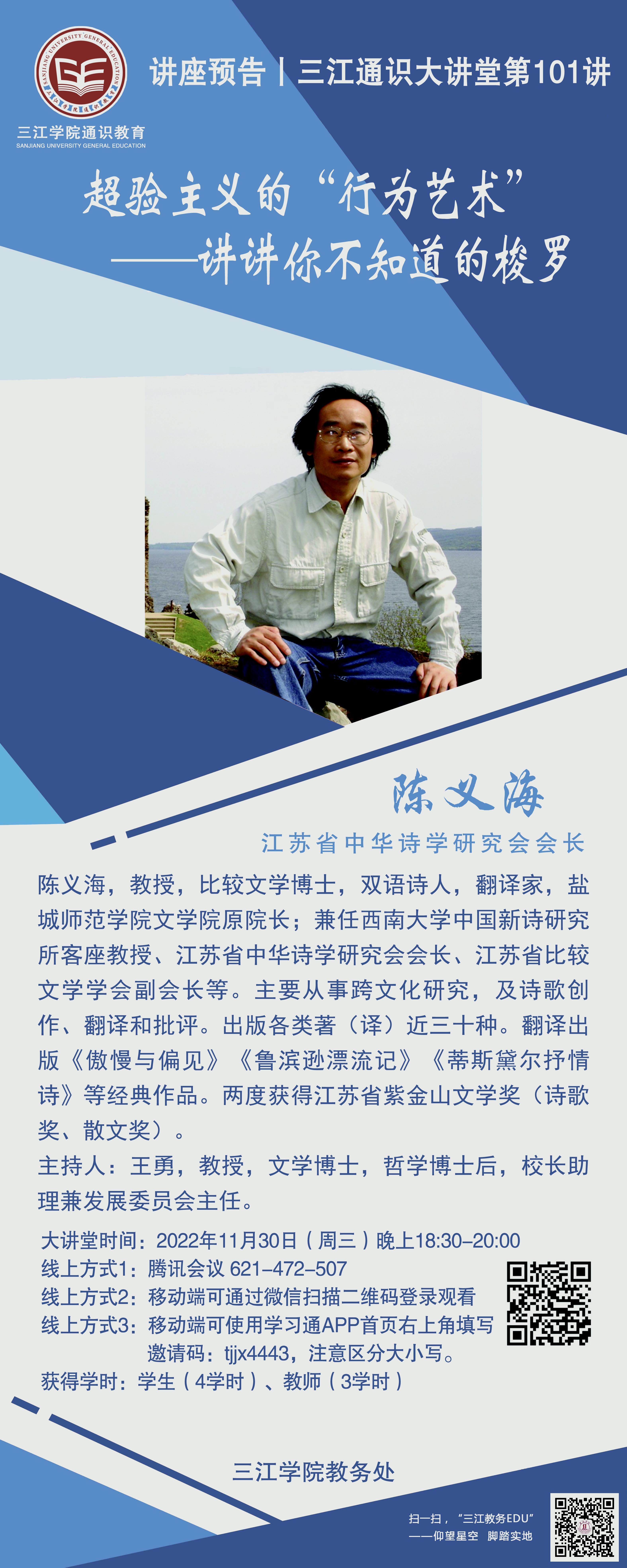 大讲堂专家:陈义海,教授,比较文学博士,双语诗人,翻译家,盐城师范学院文学院原院长;兼任西南大学中国新诗研究所客座教授、江苏省中华诗学研究会会长、江苏省比较文学学会副会长等。主要从事跨文化研究,及诗歌创作、翻译和批评。出版各类著(译)近三十种。翻译出版《傲慢与偏见》《鲁滨逊漂流记》《蒂斯黛尔抒情诗》等经典作品。两度获得江苏省紫金山文学奖(诗歌奖、散文奖)。