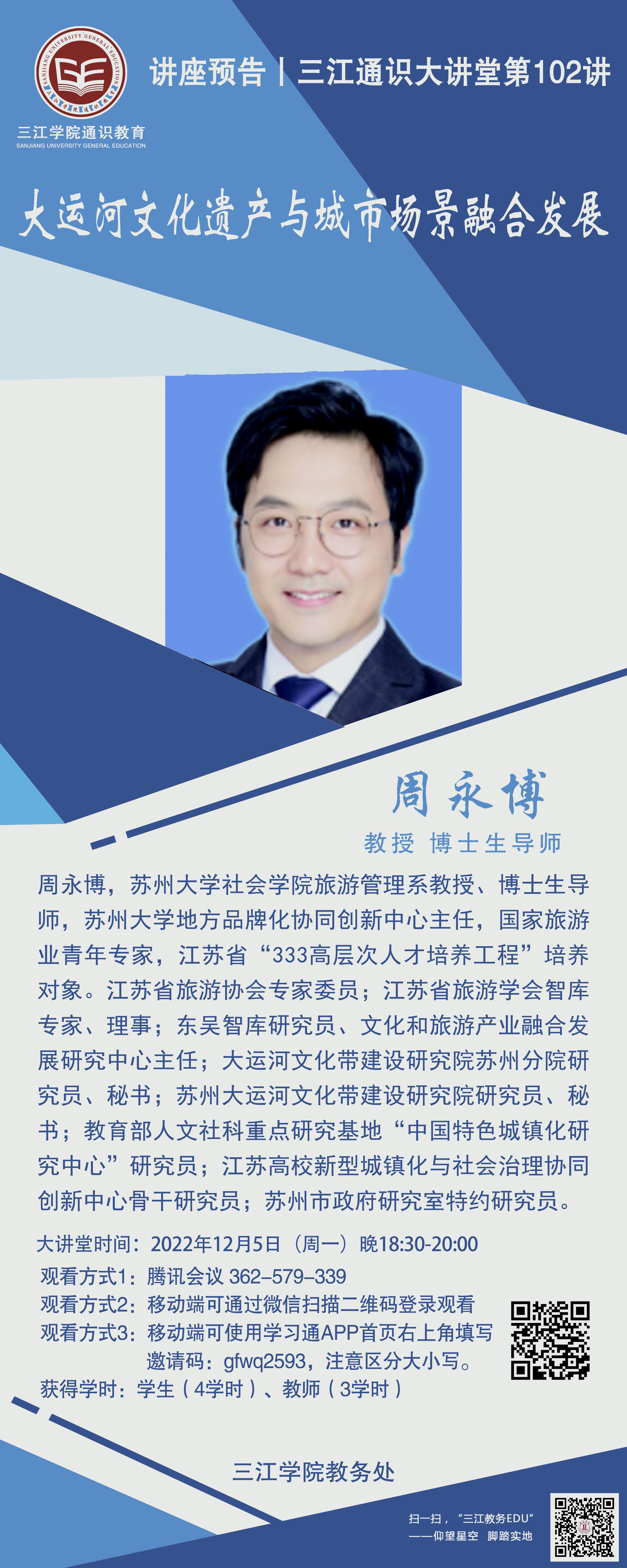 大讲堂专家:周永博,苏州大学社会学院旅游管理系教授、博士生导师,苏州大学地方品牌化协同创新中心主任,国家旅游业青年专家,江苏省“333高层次人才培养工程”培养对象。江苏省旅游协会专家委员;江苏省旅游学会智库专家、理事;东吴智库研究员、文化和旅游产业融合发展研究中心主任;大运河文化带建设研究院苏州分院研究员、秘书;苏州大运河文化带建设研究院研究员、秘书;教育部人文社科重点研究基地“中国特色城镇化研究中心”研究员;江苏高校新型城镇化与社会治理协同创新中心骨干研究员;苏州市政府研究室特约研究员。