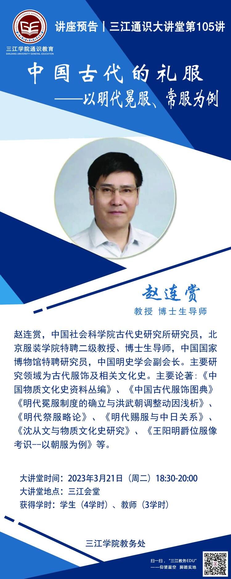 大讲堂专家:赵连赏,中国社会科学院古代史研究所研究员,北京服装学院特聘二级教授、博士生导师,中国国家博物馆特聘研究员,中国明史学会副会长。主要研究领域为古代服饰及相关文化史。主要论著:《中国物质文化史资料丛编》《中国古代服饰图典》《明代冕服制度的确立与洪武朝调整动因浅析》《明代祭服略论》《明代赐服与中日关系》《沈从文与物质文化史研究》《王阳明爵位服像考识--以朝服为例》等。