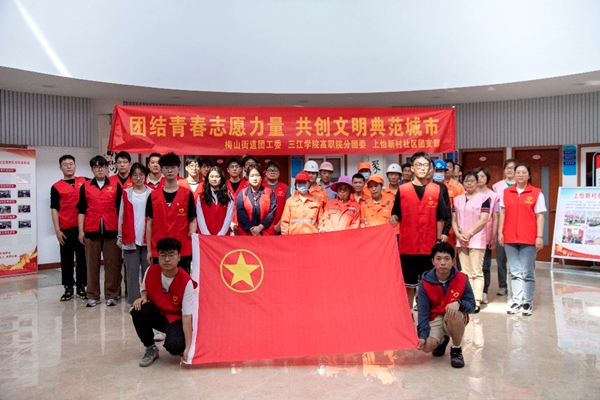 高职院团员代表、梅山街道上怡新村社区工作人员及街道物业人员合力开展“团结青春志愿力量 共创文明典范城市”文明实践志愿服务活动,对社区楼道堆积物进行统一清理搬运,极大地解决了上怡社区的垃圾堆积问题,同时也将文明创建工作细化至一楼一角、一家一户。