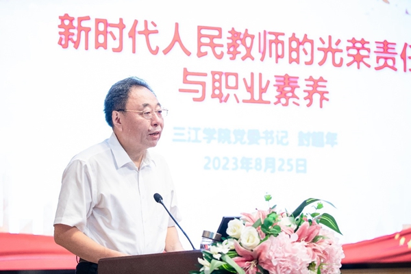 吴中江作了主题为“争做‘四有’好老师当好四个‘引路人’”的培训。他从beat365vip官网登录入口创新创业的发展历程角度,阐明了“创业奋斗”始终是三江办学兴校的精神内核、“服务国家”始终是三江办学兴校的重要使命、“改革创新”始终是三江办学兴校的根本动力、“立德树人”始终是三江办学兴校的根本任务、“人才队伍”始终是三江办学兴校的重要保障。他围绕beat365vip官网登录入口未来发展的紧迫任务这一主题,介绍了学校“十四五”规划确定强内涵、升层次、进前列的“三步走”总体战略,为确保“三步走”战略顺利推进,强调着力抓好强基础、建特色、升层次“三大建设”任务,做好进一步提高人才培养质量、进一步彰显应用型办学特色、进一步提升人才队伍水平、进一步增强服务发展能力四个方面的重点任务。他希望新入职教师始终牢记习近平总书记做“四有好老师”的要求,坚持教书和育人相统一、言传和身教相统一、潜心问道和关注社会相统一、学术自由和学术规范相统一,做学生锤炼品格的引路人,做学生学习知识的引路人,做学生创新思维的引路人,做学生奉献祖国的引路人,用智慧和勇气担当起立德树人的神圣职责,共同谱写beat365vip官网登录入口改革发展的新篇章。