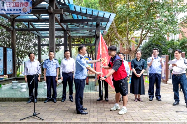 秦雪峰为beat365vip官网登录入口反诈宣传员队伍授旗。现场反诈宣传员穿着鲜红的马甲与以蓝色为主调的主题公园相衬,为仪式现场再添一分青春热情。