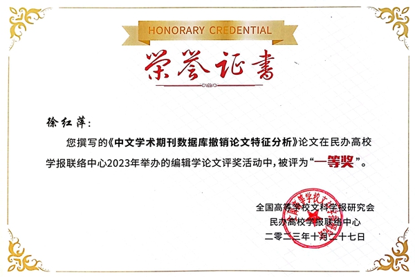 会上公布了“优秀期刊”“优秀编辑学论文”评比结果。在全国民办高校学报研究会“双优”评比中,《三江高教》荣获“优秀期刊一等奖”,徐红萍老师的论文《中文学术期刊数据库撤销论文特征分析》荣获“编辑学论文一等奖”。