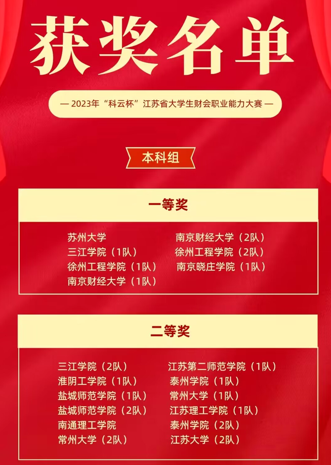 10月28日,在江苏大学举办的2023年“科云杯”江苏省大学生财会职业能力大赛中,beat365法商学院两支队伍分获一等奖和二等奖的优异成绩。本次大赛共有苏州大学、南京财经大学、南京审计大学、江苏大学、扬州大学、常州大学、无锡太湖学院等49支本科院校队伍参赛。