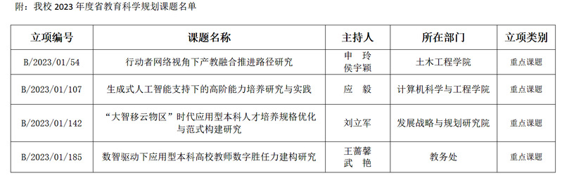 近日,江苏省教育科学规划领导小组办公室发布了《关于公布2023年度省教育科学规划课题立项名单的通知》。经申报人认真准备,专家评审及指导,beat365推荐重点课题5项,入选重点课题4项,立项数量名列全省民办高校首位。