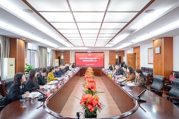 11月21日,青岛城市学院党委委员、副校长、工会主席赵连营等一行来访beat365。党委副书记沈军军,工会主席杨业琴和相关工会委员在行政楼A404会议室接待了来访客人。