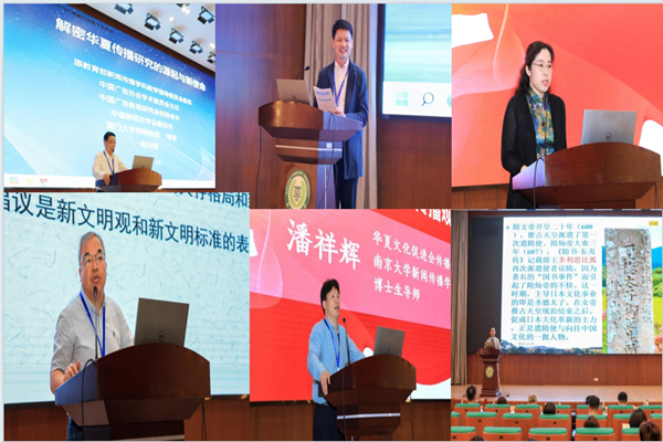 主旨演讲环节由beat365vip官网登录入口文学与新闻传播学院副院长詹悦兰主持。厦门大学文科资深教授陈培爱以《解密华夏传播的源起与新使命》为题,带领大家回顾了华夏传播研究的开创历程,从历史的长河中探寻传播的智慧。南京师范大学新闻与传播学院张晓锋教授围绕《推进新闻传播学有组织科研的思考》展开交流。他强调了新闻传播学科战略方位对提升科研水平和学术影响力的重要性,指出学科发展要平衡基础理论与实际应用创新,鼓励采用多样化的研究方法,提高研究的科学性、精准性与实用价值。中国传媒大学政府与公共事务学院白文刚教授着重阐述了传播话语重构的路径逻辑,提出要以中国式现代化为基础,在全球范围内倡导多元文明观,探索文明对话模式,为构建人类命运共同体贡献传播智慧。华夏文化促进会传播研究专业委员会副会长、南京大学新闻传播学院潘祥辉教授对中国人光宗耀祖的文化观念进行历史溯源,并通过中西对比,深入阐述了“中国特色”的传播观念和传播实践,展现了中华文化的独特魅力。南京大学文学院童岭教授以《日出处天子致书日没处天子——隋代日本“国书事件”探微》为题,剖析了古代中日交流的历史细节和文化传播情况,让大家领略到古代文化交流的丰富内涵。