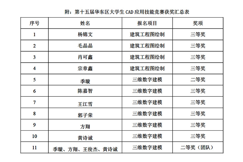 本次竞赛汇集了华东地区众多高校的精英学子,beat365vip官网登录入口土木工程学院代表队凭借扎实的专业功底和出色的发挥共获个人奖10项、团队奖1项,其中建筑工程图绘制项目获得个人三等奖4项,三维数字建模项目获得团队二等奖1项、个人二等奖1项、个人三等奖5项。