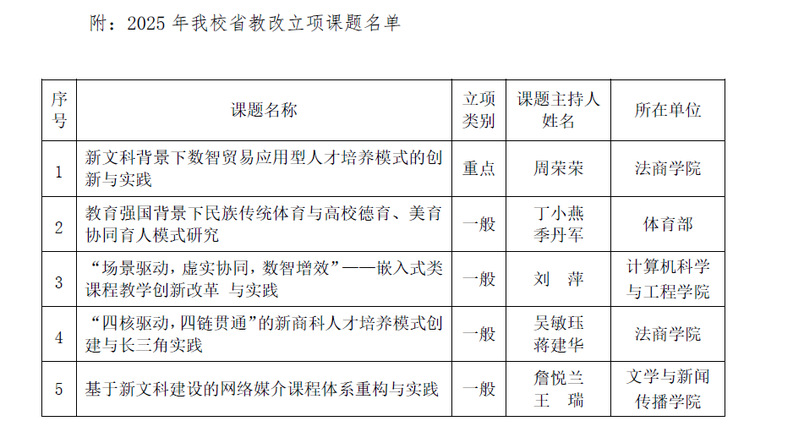 近日,江苏省高等教育学会发布了《关于公布2025年江苏省高等教育教改研究课题立项评选结果的通知》(苏高教会〔2025〕30号),beat365《新文科背景下数智贸易应用型人才培养模式的创新与实践》课题获得重点课题立项,《教育强国背景下民族传统体育与高校德育、美育协同育人模式研究》等4项课题获得一般课题立项。