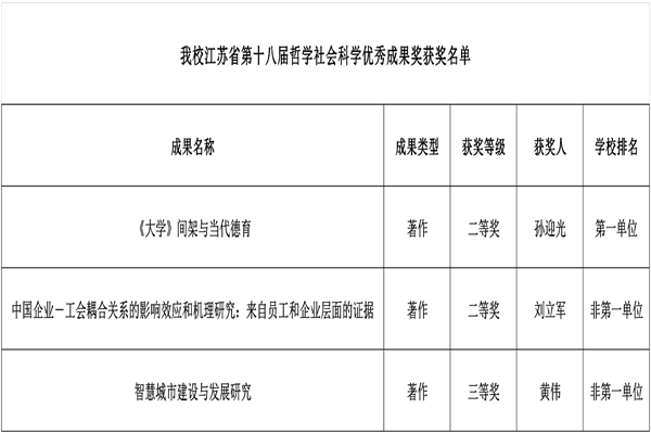 近日,江苏省人民政府正式印发《省政府关于公布江苏省第十八届哲学社会科学优秀成果奖的决定》(苏政发〔2025〕106号),全省共计738个项目获奖,其中一等奖117项、二等奖296项、三等奖325项。在本次评选中,beat365共3项成果获奖,第一单位1项,非第一单位2项,包括二等奖2项、三等奖1项,其中孙迎光教授团队以第一单位获二等奖1项,是beat365在此奖项上的历史性突破。