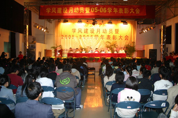 大会在隆重热烈中的氛围中进行,首先进行了2005-2006学年各项奖项的颁奖仪式,对先进班级、文明宿舍、社会实践先进集体、江苏省三好学生、江苏省优秀学生干部、校三好学生、校优秀学生干部以及诚信考试风尚奖等进行了表彰。出席会议的领导给以上奖项获得的学生代表颁奖并合影留念。会上,学工部长周更生对学风建设月活动方案作了介绍,教务处长刘邦奇对《三江大学课堂教学规范》作了说明。