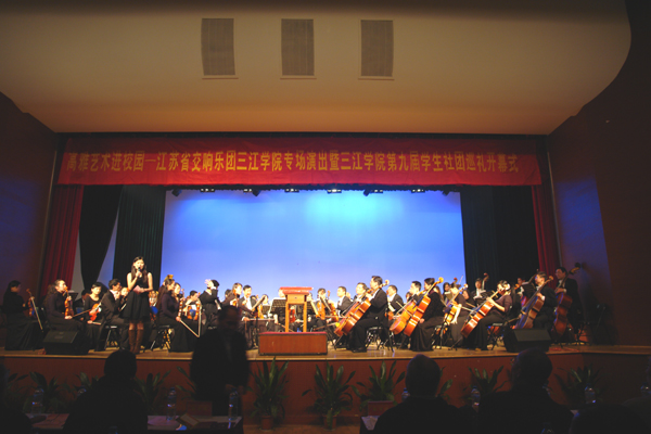 11月19日晚,高雅艺术走进了三江校园。江苏省交响乐团在三江会堂进行了专场演出,副校长王芝庆登台讲话,他对江苏省交响乐团的艺术家们的光临表示热烈欢迎和衷心感谢,同时宣布,beat365vip官网登录入口第九届学生社团巡礼正式开幕。
