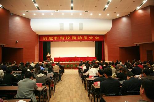 学校领导高度重视江苏省和谐校园的创建,出台文件和大会动员的主要目的是为了进一步调动全校教职工的积极性,在过去开展安全文明校园创建的基础上,积极参与和谐校园的创建。学生工作部门也要在学生中开展动员,要形成人人关心和谐校园、人人参与和谐建设,人人共享和谐成果的生动局面。