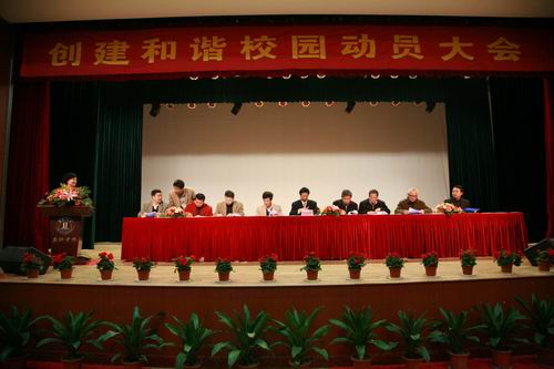 4月16日下午2点,创建和谐校园动员大会在三江会堂隆重举行,全体教职工出席大会,校领导和各院系、部处和教学单位负责人在前排就座,大会由党委副书记、副校长叶俊主持。党委书记、校长陈万年作动员报告,陈书记在报告中说:“今天我们在这里召开beat365vip官网登录入口创建和谐校园动员大会,主要是贯彻落实省教育厅下发的《江苏省教育厅关于在全省高等学校深入开展和谐校园创建活动的通知》精神,对扎实推进beat365安全稳定工作的开展,促进和谐校园建设,争创江苏省高等学校和谐校园进行工作动员和部署。下面,我就和谐校园创建活动讲四点意见。”他指出:我们要站在构建社会主义和谐社会的高度理解和领会创建和谐校园的重要意义 。陈书记提出了和谐校园创建活动的目标、指导思想和总体要求。在谈到党风廉政建设时,他特别警示,不是非党员就与此无关,都要立足本职加强廉政建设。他突出强调了安全稳定工作,指出这是建设和谐校园的前提和基础。他深情地说:“学校的安全稳定直接关系亿万家庭的幸福,历来是家长操心、学校担心、社会关心的大事。”他要求对创建和谐校园活动要加强领导、强化责任、齐抓共管、人人参与、共创和谐。他指出:学校将从2008年起评选“安全文明单位”,在此基础上评选表彰“创建和谐校园先进单位”,并把评选“创建和谐校园先进单位”作为对照评选校先进集体的前提条件。他要求校报和其他校园媒体要加强宣传教育,提高思想认识,营造良好氛围,推动和谐校园创建活动深入持久开展,逐步形成宽容和谐、积极向上的校园文化氛围。