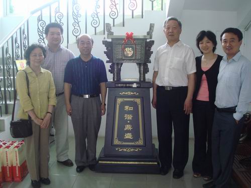 (骆志斌常务副校长、建筑系主任李孝宋、校长(党委)办公室主任周更生与校友在青铜鼎礼物前合影)
