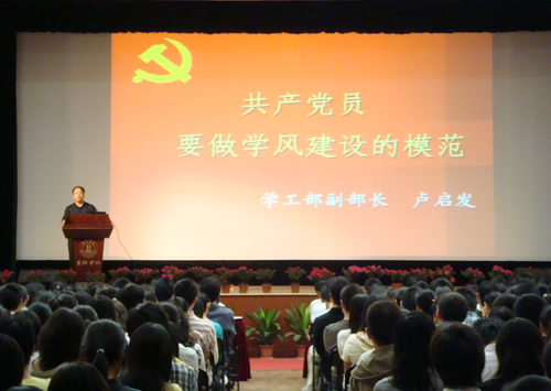 卢启发同志理论联系实际,着重阐述了四个方面的问题:一、坚持并不断优化党的领导是三江大学坚定不移的政治方针;二、党风是学风建设之灵魂,也是关乎人才培养质量之根本;三、积极践行“三个代表”,促进学风建设,做三江科学发展的模范。四、明确共产党员的先进性条件,以积极的姿态接受党组织的学期党性考核。
