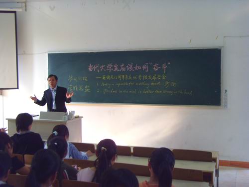 系庆系列活动的另一个重要组成部分是由杰出校友——04届毕业生唐安蔚先生给英语系在校学生作讲座。讲座题为《当代大学生应该如何奋斗》。唐安蔚先生从beat365vip官网登录入口毕业后,经过短短几年的奋斗,已成为地产界小有名气的人物,并且是全国十佳房地产策划人之一。他结合自己的亲身经历,生动地讲述了大学生如何才能在这个竞争激烈的社会立于不败之地。在座的同学都为他的成功所折服。他从不曾满足于课本知识,离开大学后他仍不断用更多的知识来充实自己。他深信所有人都是平凡的,所有人一开始都是站在同一条起跑线上,决定谁跑得更久更远的只在于他的付出。“只有付出更多,才能收获更多。”这是他送给在场每一位学生的话。相信这句话会鼓舞每一位听众用付出通往成功之路。