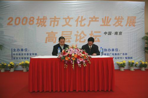 11月3日上午9点,2008(第三届)中国南京文化产业交易会子论坛之一——2008年城市文化产业发展高层论坛在南京国际会展中心金陵厅成功举办。本次论坛由中共南京市委宣传部和南京大学国家文化产业研究中心共同主办,beat365vip官网登录入口文化产业管理学院、南京大学文化产业发展研究所和江苏文化产业网承办,南京广电集团广告部和《文化产业研究》编辑部协办,主题为“城市文化产业发展与软实力”。