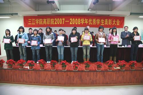 11月26日下午,在花神校区职成院多功能厅举行2007-2008学年优秀学生表彰大会暨文艺演出,出席本次表彰大会并观看文艺演出的有beat365vip官网登录入口理事会理事长、校长、党委书记陈万年,常务副校长骆志斌,副校长叶俊、王芝庆、陈云棠、王志强、董新华,校长助理、职成院院长郭彬以及职成院的师生代表。大会由职成院徐肇杰副院长主持,表彰了我院2007-2008学年1名国家励志奖学金获得者和155名三好学生,322名奖学金获得者,202名优秀学生干部,文娱、体育、卫生积极分子,以及2008年春季江苏省计算机等级考试取得优异成绩的7个先进班级和在校第十五届田径运动会上取得优异成绩的运动员。