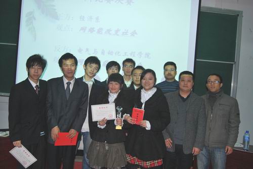 最精彩、最巅峰的力量交锋还数第二场正方经济系代表队与反方电气与自动化工程学院代表队的冠军争夺战。选手们着装齐整,儒雅而有风度。一场幽默而轻松的辩论赛,席间两方对抗让我们不得不惊叹于他们的才智与逻辑思维。 最后正方经济系代表队以超强的应辩能力,充分的论据以及翩翩的绅士风度赢得了本届辩论赛的总冠军。反方三辩赵荣同学也以其机智幽默的精彩表现获得了本次大赛的最佳辩手称号。