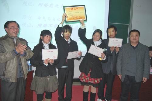 党委宣传部王勇部长为比赛做了最后点评,为选手们指出了不足之处,也表扬了双方辩手在这场比赛中的优异发挥。最后,屈伯俊部长给我们的冠亚军及最佳辩手颁发了奖状、证书和奖杯。同时,获得本届辩论赛的两名优秀组织奖的获得者——电子信息工程学院和高职院的领队也上台领取了奖状。