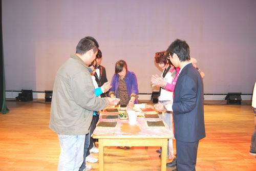 本次晚会突破了以前大家所认为的互动环节即恶搞或者做游戏的理念,互动环节作为本次晚会的亮点之一,我们将日本的风俗文化搬上了舞台,瞧,嘉宾、观众、工作人员聚在一张桌子面前干什么呢?走近一看,原来是在做寿司,十分钟之后,他们将自己的杰作拿下舞台给大家品尝起来,怎么样,还不错吧?再看舞台的另一端,也有几个女生在做手工活,据悉,她们做的是“草屐”,这将作为幸运奖送给在场的观众。