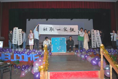 晚会中有个节目叫《琴棋书香韵》,在大家的期待中,书法协会的同学们为大家呈现了“社联一家亲”五个大字,并把这幅字送给了社联,他们希望这一家可以一直亲,并且不断强大。晚会中有个节目叫《情系社联十周年》,全场灯光熄灭,生日歌响起,一群可爱的人把点着十只蜡烛的生日蛋糕推上舞台,全场沸腾了,大家一起唱起生日歌。“社联,生日快乐,下一个十年,再下一个十年,我们会更加绚烂地相聚。”这是大家的愿望。晚会中还有一个节目,它的题目是《甜蜜蜜》,社联的负责人一起唱响这首歌,唱响属于我们的甜和蜜。