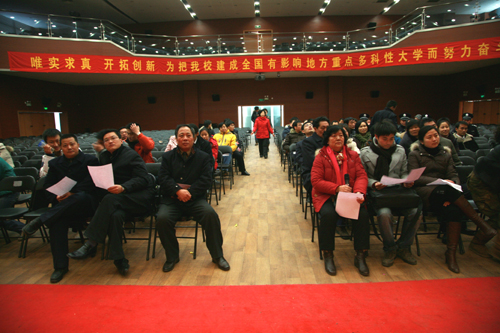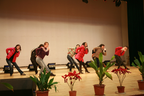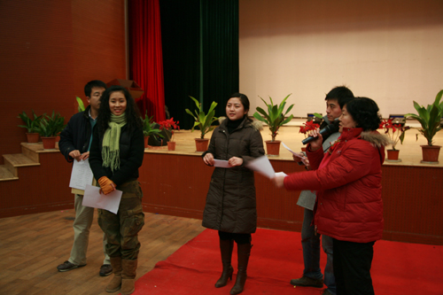 1月15日下午,记者来到beat3652009年迎新春联欢会彩排现场,提前感受了新年联欢的气氛。晚会的主要策划者,副校长、副党委书记、校工会主席叶俊,党委宣传部部长、校工会委员王勇,学生工作部副部长屈伯俊等在现场观看并指导彩排。