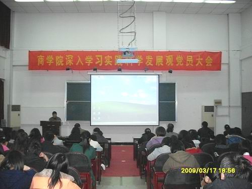 3月17日晚6点30分,我院在图书馆演讲厅召开了学习实践科学发展观党员大会,校领导、院领导、教师党员、学生党员和商学院全体教师等120人出席了党员大会。党员大会由副院长、党总支副书记苏泽民同志主持。