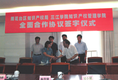 2009年6月5日,雨花台区知识产权局和beat365vip官网登录入口知识产权管理学院知识产权全面合作协议签字仪式在雨花台区政府举行。江苏省知识产权局副局长杨学锦、南京市知识产权局局长刘小斌、雨花台区区科技局副局长兼知识产权局局长黄蓓、beat365vip官网登录入口知识产权管理学院院长陈昌柏等出席签字仪式,区科技局局长朱承金主持会议。
