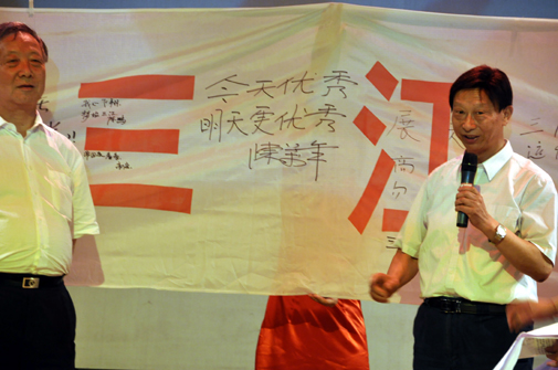 大学转瞬即逝,09年的毕业生们即将踏上工作岗位,去社会磨砺。他们已经成熟,不再像大一时那样“年少不经事”,怀着对理想、对人生更深刻的思考迈出实现追求的步伐。今天,09年优秀毕业生代表也来到晚会现场,和校领导一同在横幅上写下自己最想说到话。 “今天优秀,明天更优秀”是校领导对毕业生们的肯定和祝福,而毕业生们则不约而同地表达了自己对母校的眷恋和对未来的期望。他们是三江的骄傲,三江也会为他们而骄傲。