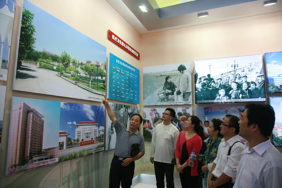 各位老师在展厅里浏览新中国成立60周年来江苏省取得的巨大成就,在感兴趣的图片、实物前驻足、讨论。在参观教育版块时,各位老师意外发现了beat365展板也列入了展区,大家都被展板所吸引,在为祖国发展、为江苏发展感叹的同时,也为三江的发展感到自豪。各位老师都非常的兴奋,在展板前合影留恋。