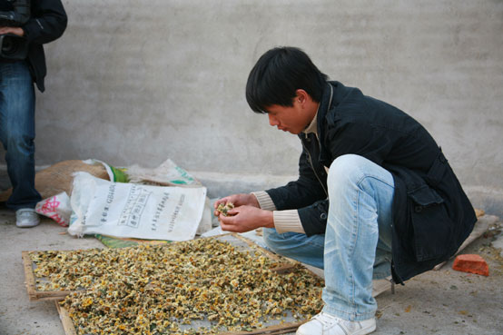 秦树峰正在进行菊花加工